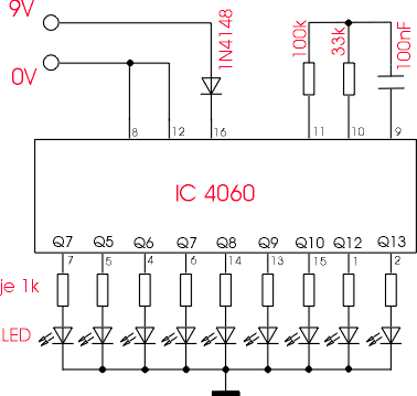 Das CMOS-IC 4060 (14-stufiger Zähler mit Oszillator) steuert 9 LED´s direkt an.Schaltung: