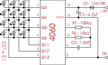D1 = 1N4148; IC = 4060; 12 LED 10mA
